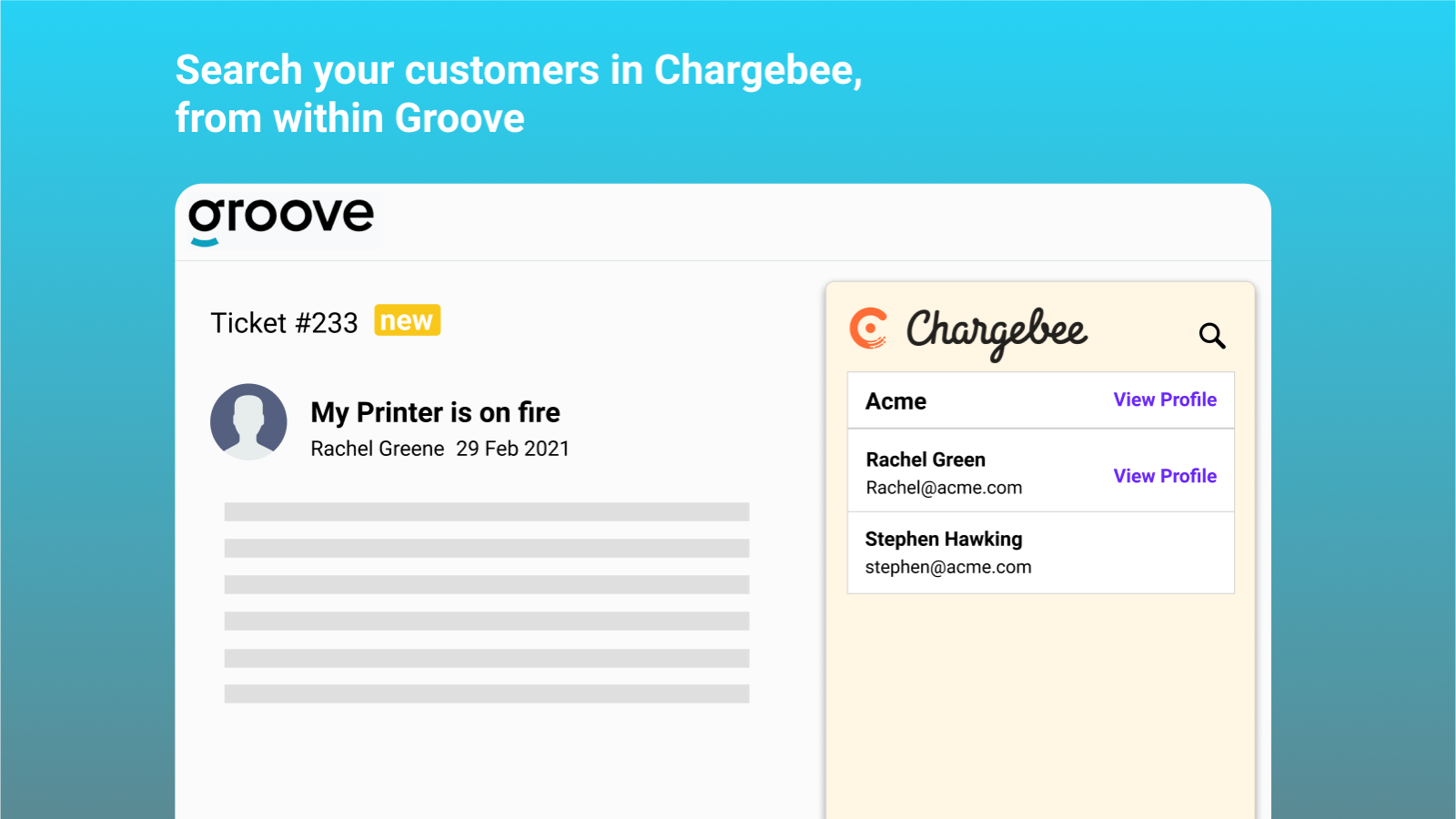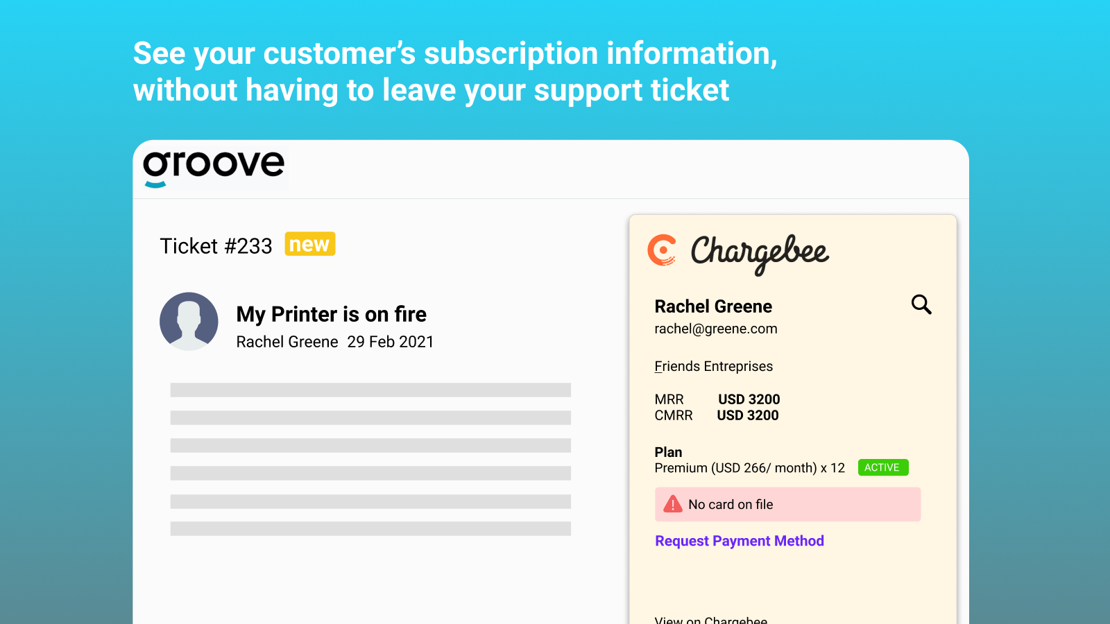 Groove is a cloud-based helpdesk application which helps track and manage customer support tickets, enabling the support teams to resolve customer issues effectively. Chargebee's app for Groove displays customer and subscription information right next to the support ticket. Hence, boosts productivity of your customer support teams by eliminating the need to toggle between browser tabs in search of customer's subscription information.