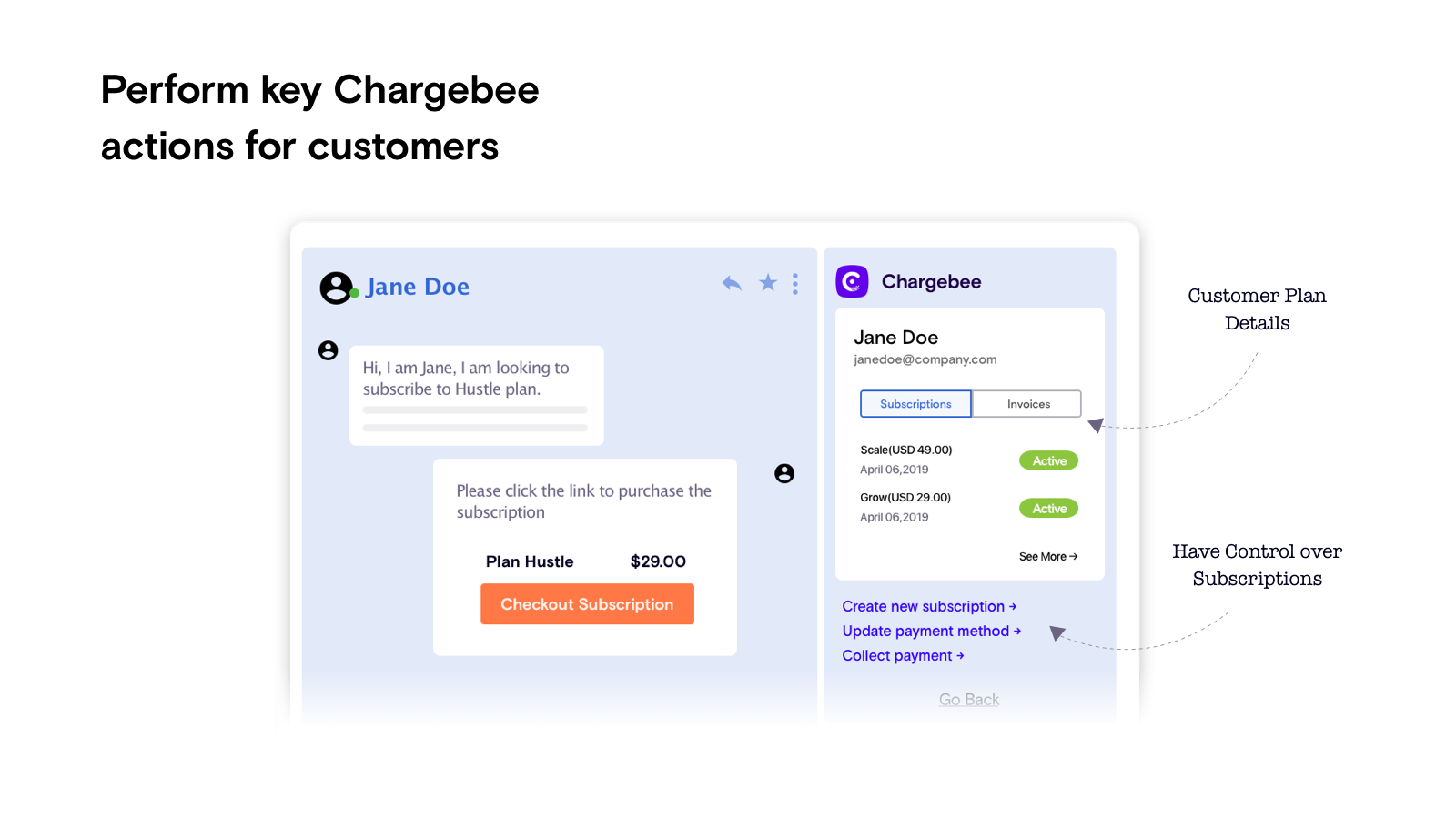 Intercom empowers businesses to have contextual conversations with customers by tracking product usage and customer activity. Chargebee's app for Intercom Inbox allows you to view the subscription and invoice details of your customers from within Intercom Inbox. With this app, you can also create a new subscription, request payment method, and even collect payments.