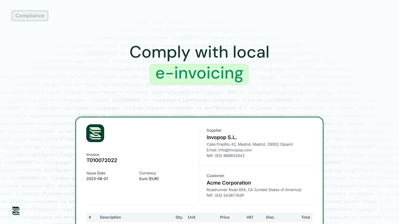 Invopop ensures your invoices comply with local fiscal regulations worldwide. Our Chargebee integration seamlessly syncs every invoice and credit note, converting them into the required format—whether it’s e-invoices or fiscalized PDFs—and reports them to the appropriate tax authority or invoice network. All of this happens automatically, without leaving your Chargebee environment.