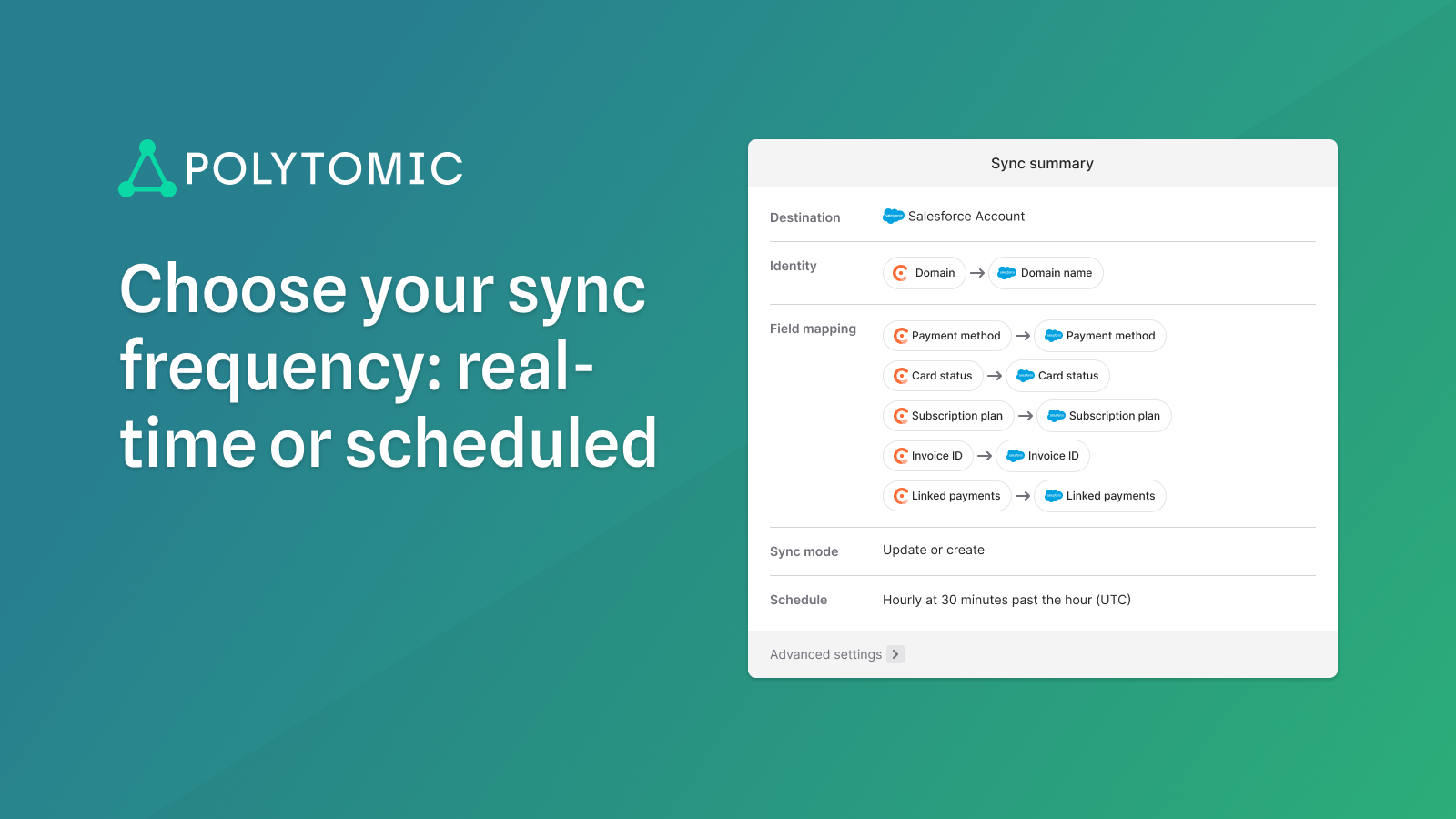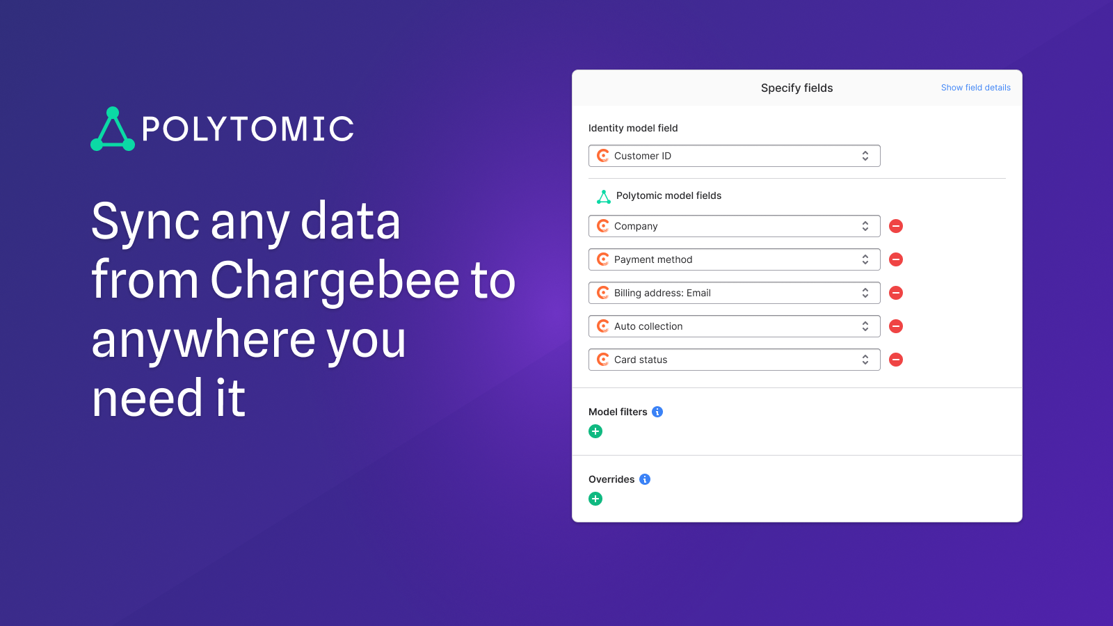 Sync customer or subscription data in Chargebee to your CRM, finance system, data warehouse, or spreadsheets. Setup is quick and no coding is required to sync data where you need it. Just point, click, and go.