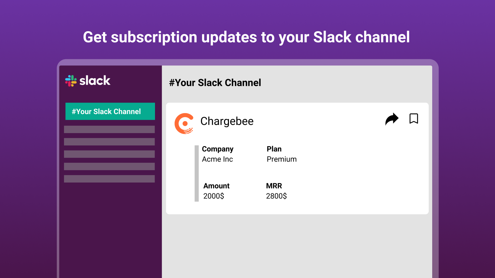 Slack has already become your mordern workspace. Chargebee's integration with Slack allows you to receive subscription notifications right into your Slack channel. You can track key subscription actions such as, Subscription activations, cancellations, and payment failures, all without having to leave your slack channel.