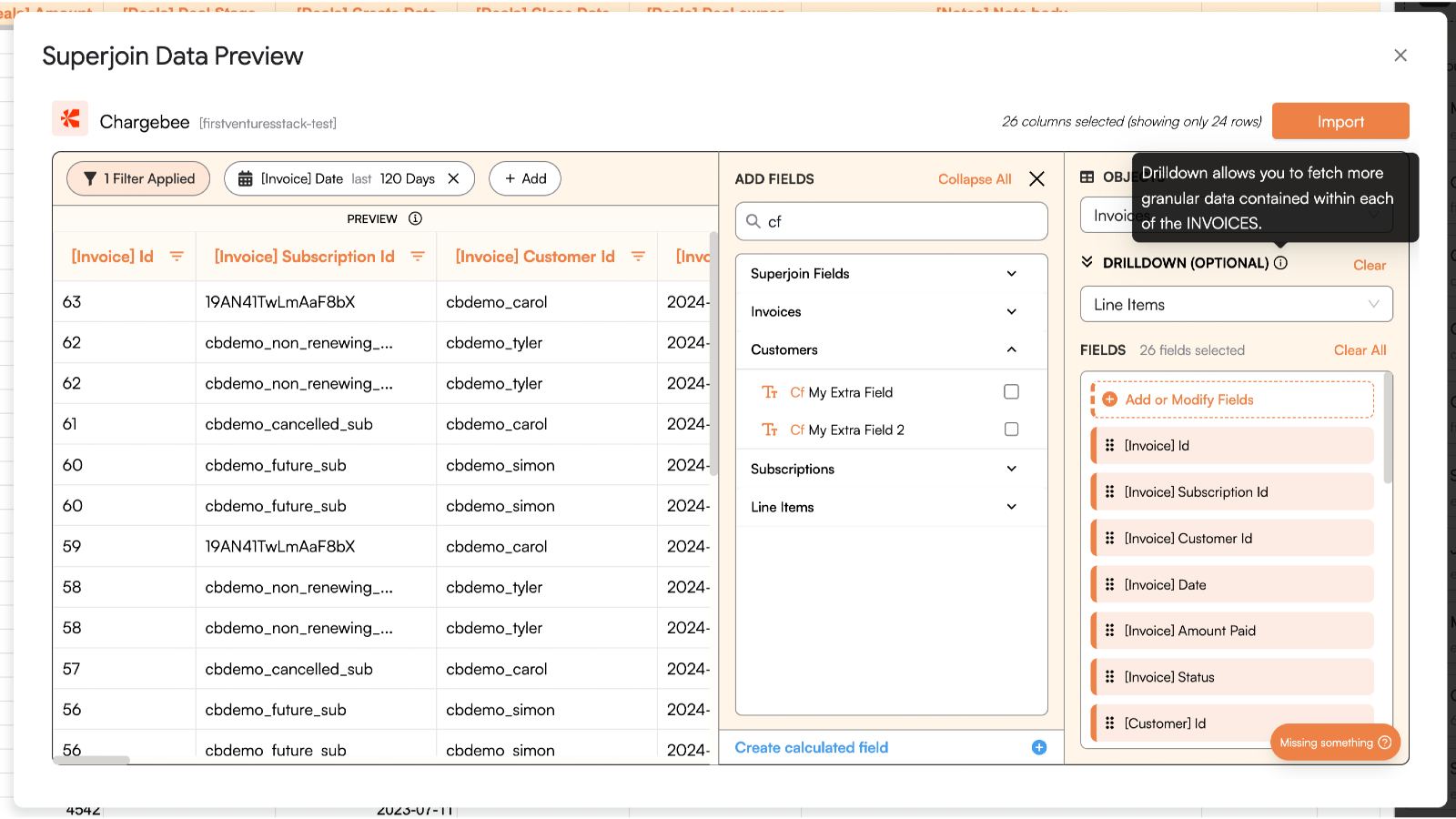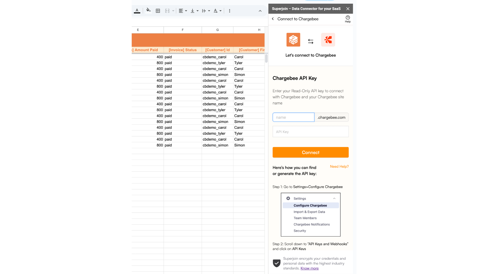 Superjoin allows business teams to pull Subscription, Invoices, Credit Notes, etc from Chargebee into Google Sheets in 1 click & refresh it automatically. With advanced capabilities like Drill Down, Calculated Fields & Advanced Filters you can say goodbye to the time-consuming process of manually copy pasting & applying VLookups.