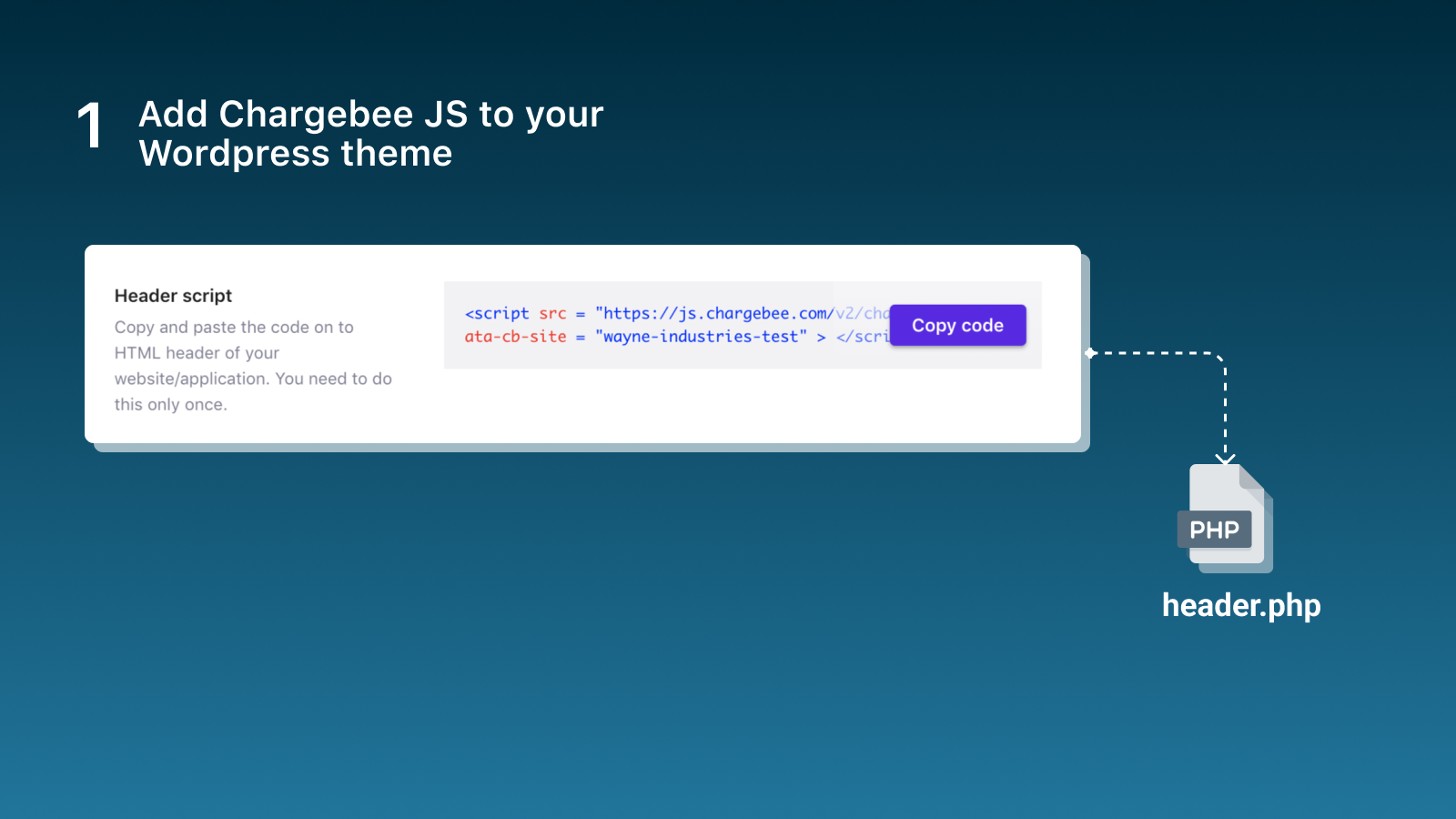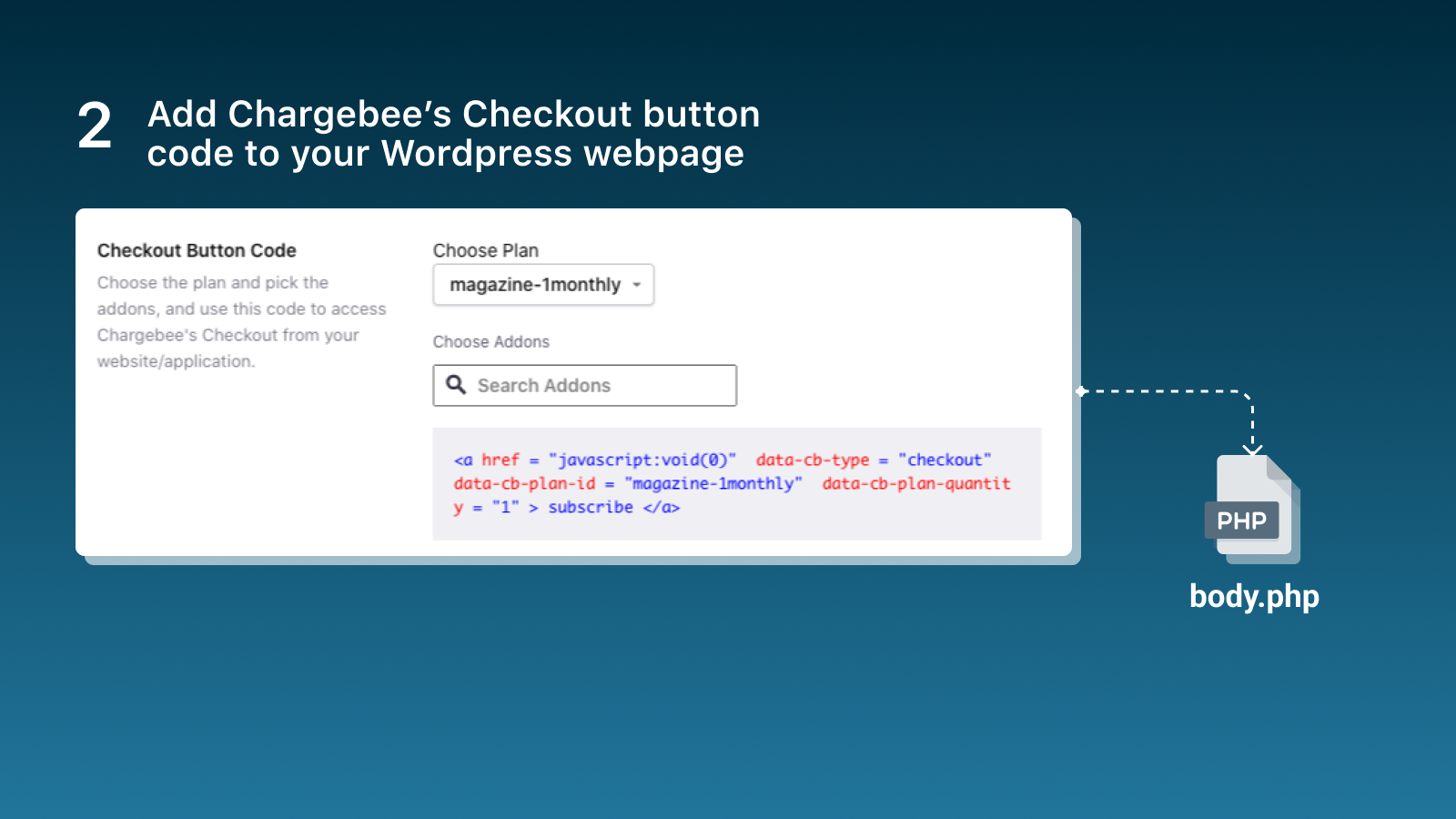Simply copy "Chargebee.js" file into the head section of your Wordpress theme, and add the checkout link to your "Subscribe" button on your webpage.